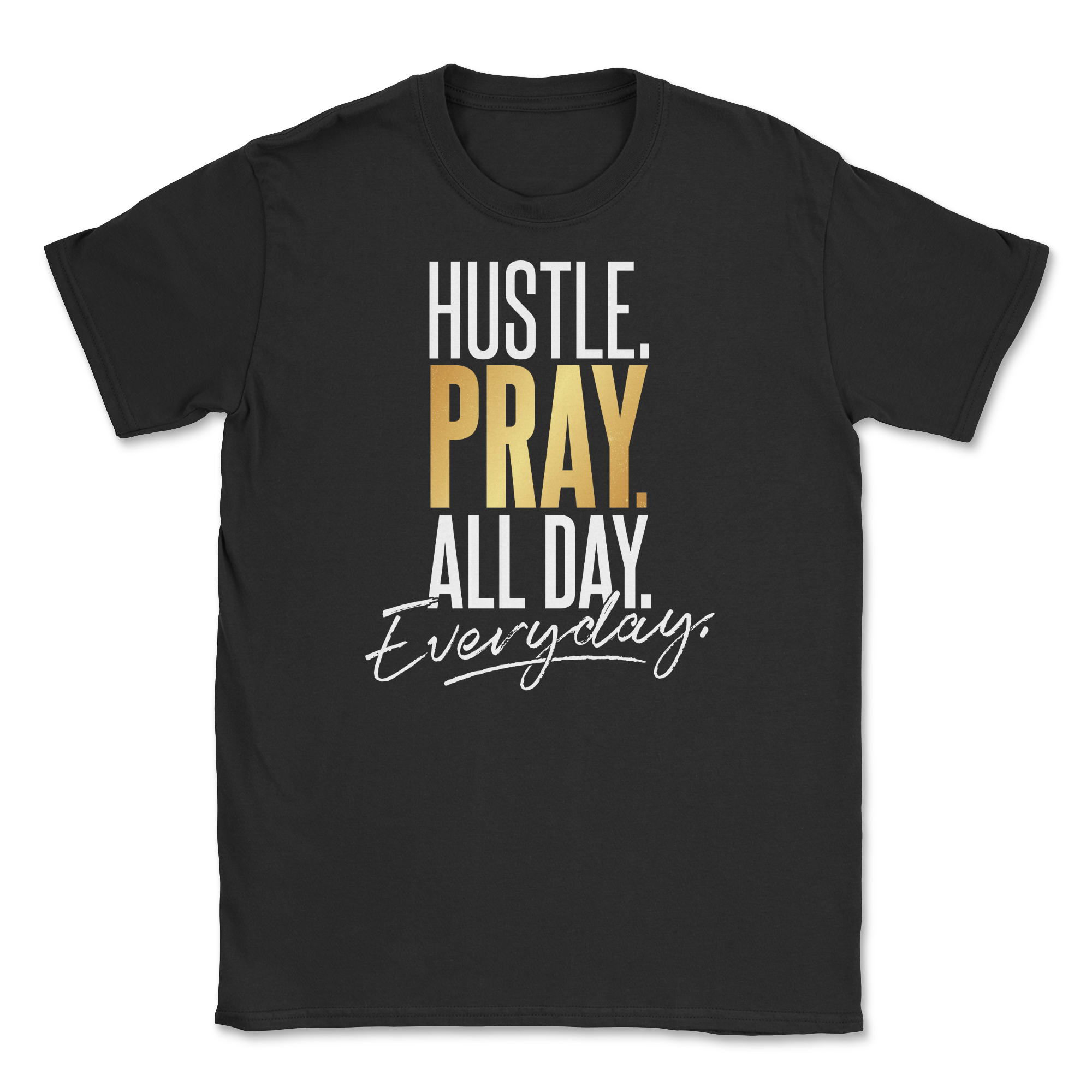 A modern T-shirt by Boldly Xxpress. Detailed with signature classic crew neck. This T-shirt is elevated by digitally printed soft to touch Hustle Pray All Day Everyday logo. The top is cut in pure cotton for everyday softness.