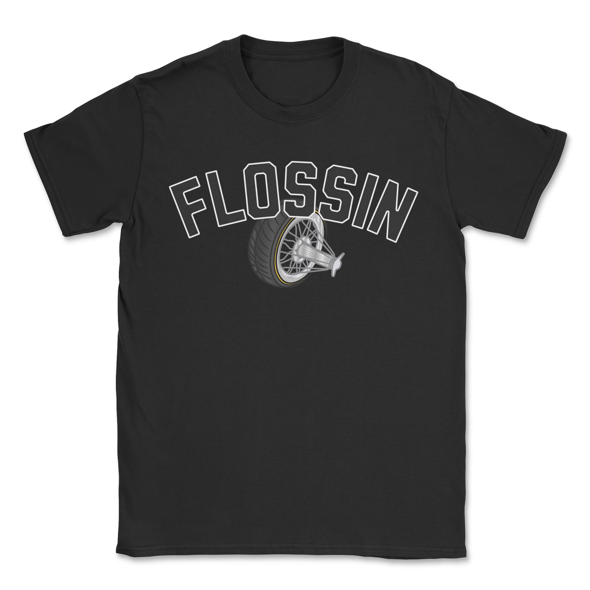 A modern T-shirt by Boldly Xxpress. Detailed with signature crew neck. This T-shirt is elevated by digitally printed soft to touch Flossin Slab wheel logo. The top is cut in pure cotton for everyday softness.